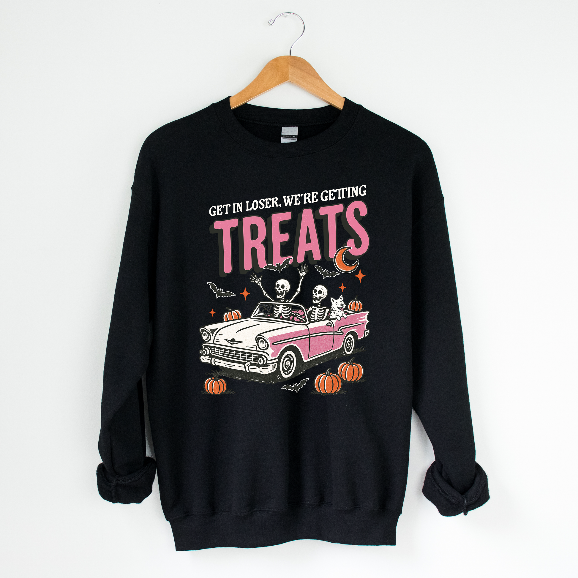 Get in loser, we're getting treats! Our dog loving twist on this famous quote. Featuring two skeleton besties and their ride or die pup cruising in a classic pink car. Playful and spooky with a retro Halloween graphic. These cozy sweatshirts have a slightly oversized fit. Roomy enough for easy layering, yet stylish enough to wear on its own.