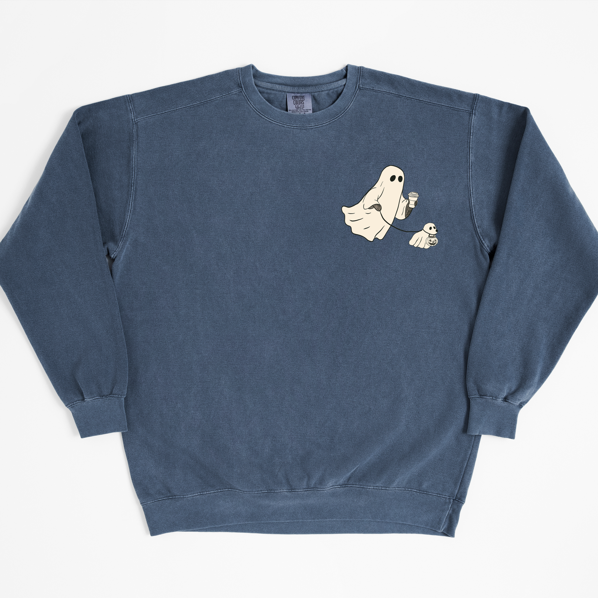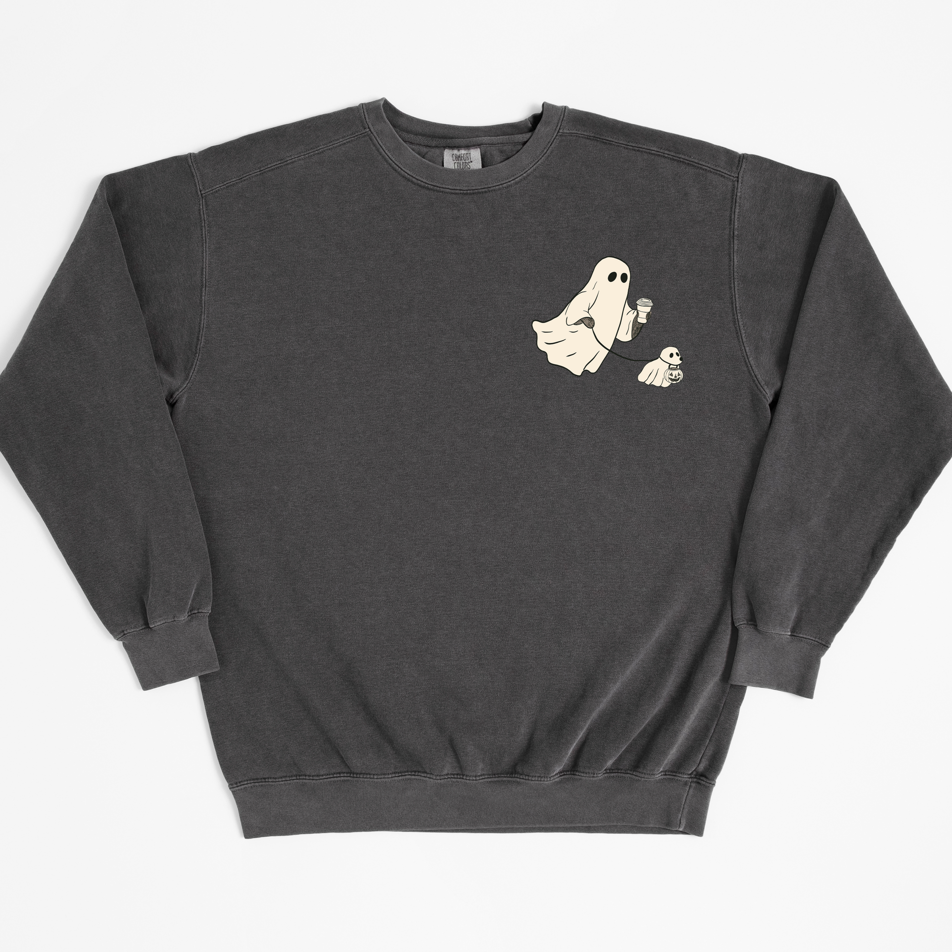 A trick or treat ghost walk with coffee in hand in a playful drawn sketch with a vintage feel. A minimal pocket size print version of our Ghoul's Best Friend shirt. These cozy sweatshirts have a slightly oversized fit. Roomy enough for easy layering, yet stylish enough to wear on its own.