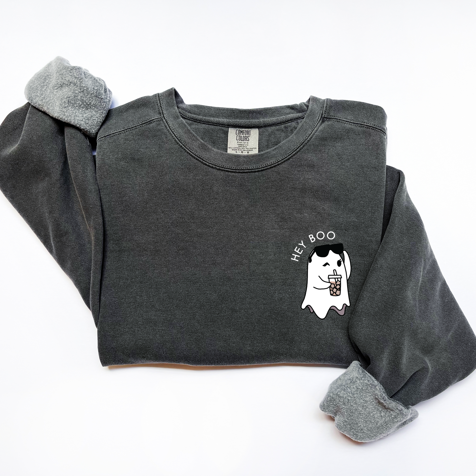 Our Hey Boo Iced Coffee Ghost Sweatshirt is perfect for anyone who runs on caffeine and a touch of spooky charm all year round. These cozy sweatshirts have a slightly oversized fit. Roomy enough for easy layering, yet stylish enough to wear on its own.