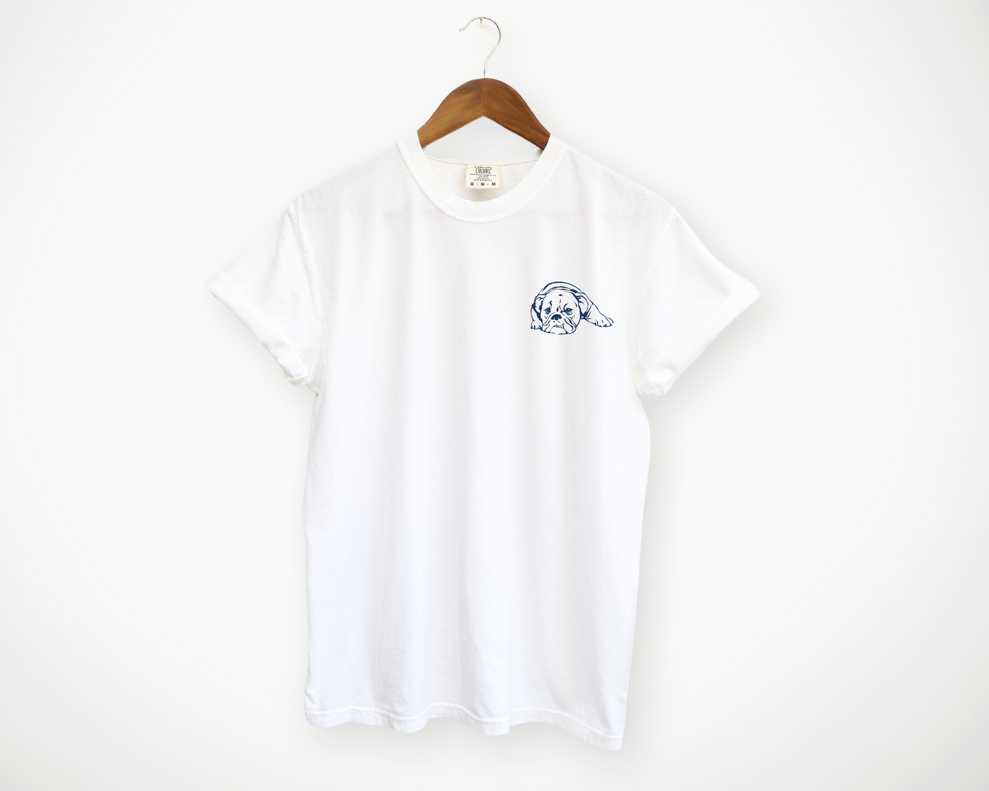 Our original Mugsy's Merch tee, featuring our lounging Bulldog Mugsy on the front with brand icon on the back. Ultra soft and made for comfort!