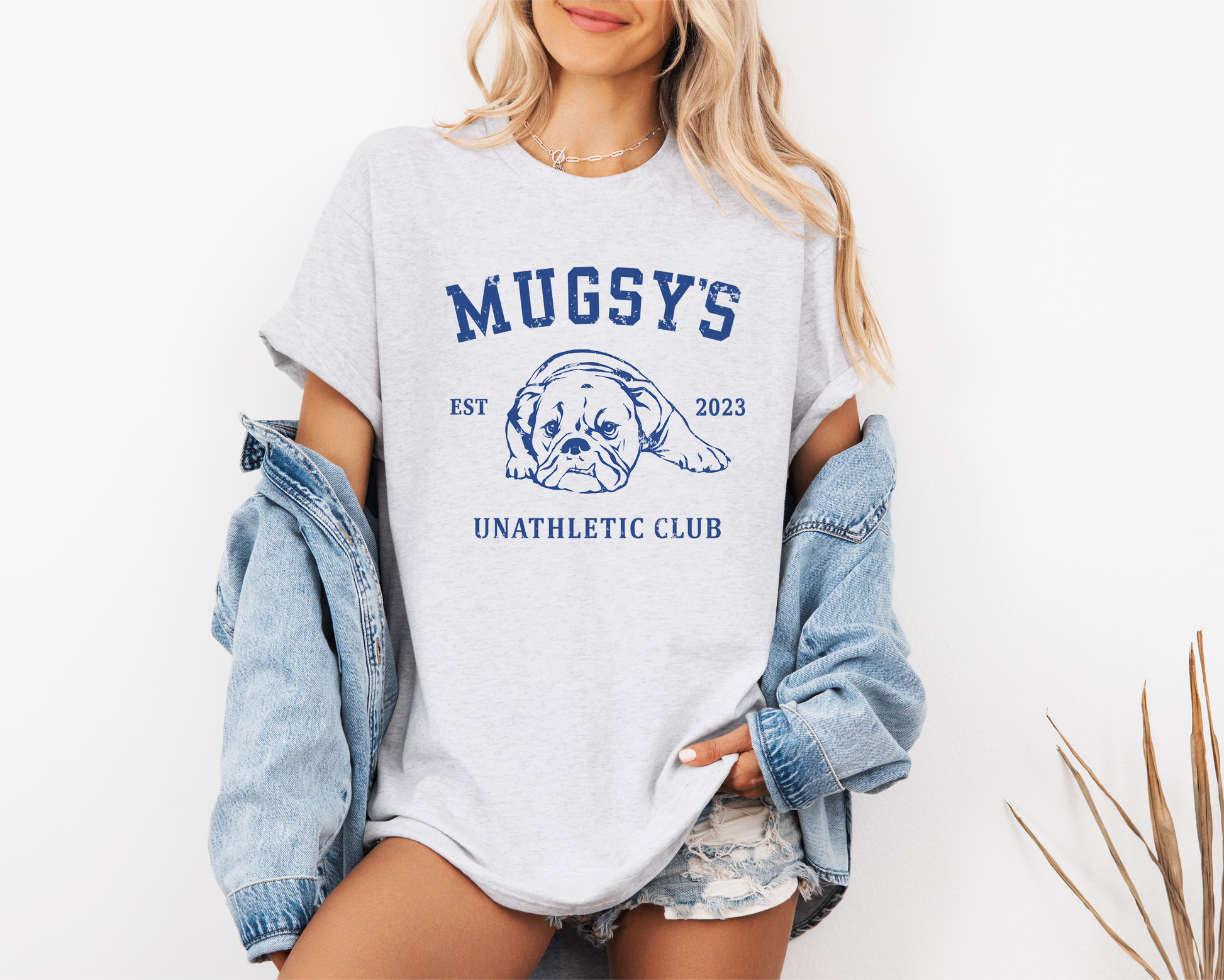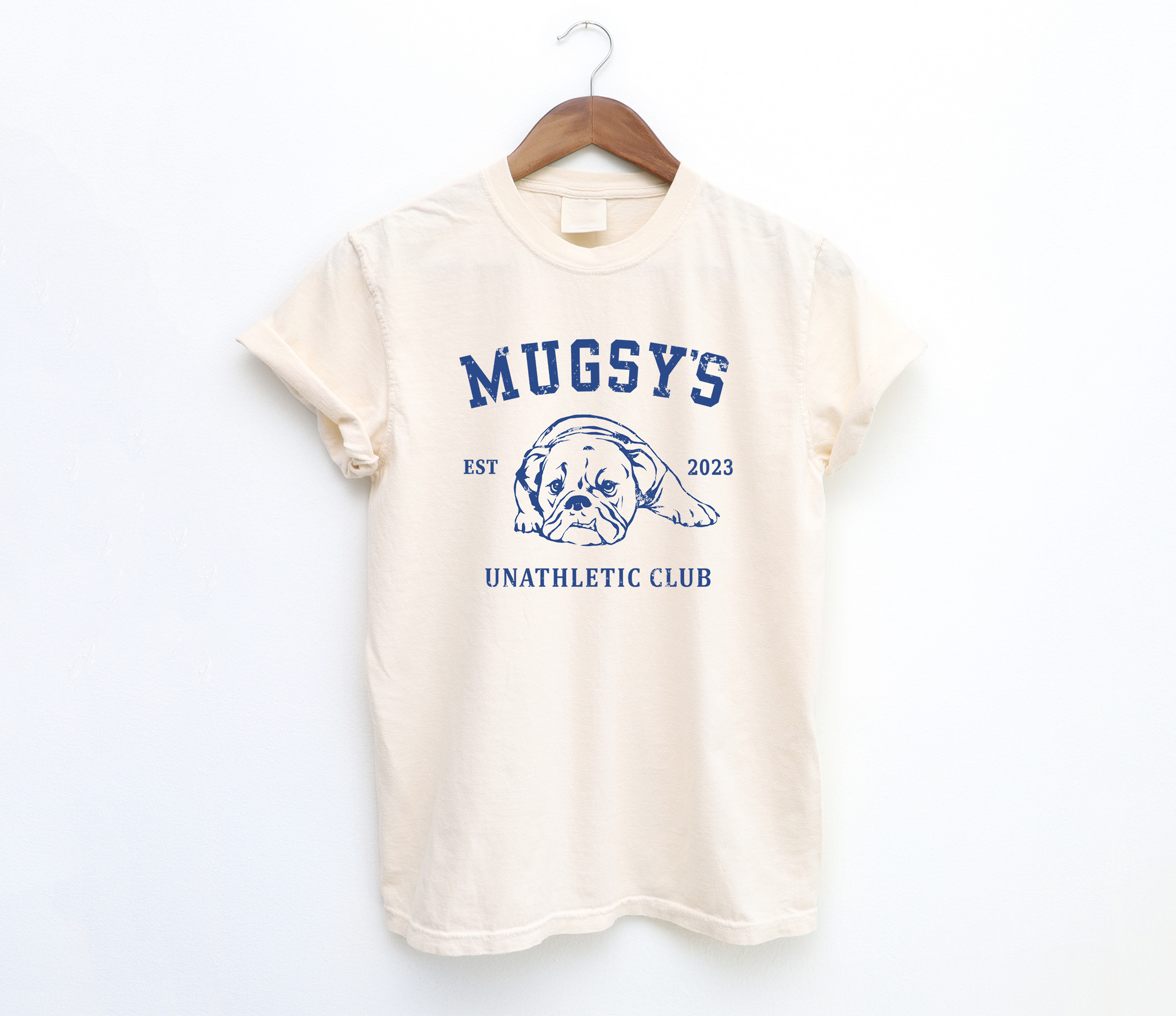 Our Mugsy's Unathletic Club tee features a sketch of Mugsy herself doing what Bulldogs do best, lounging and living the good life. Relaxed unisex fit with a distressed print.