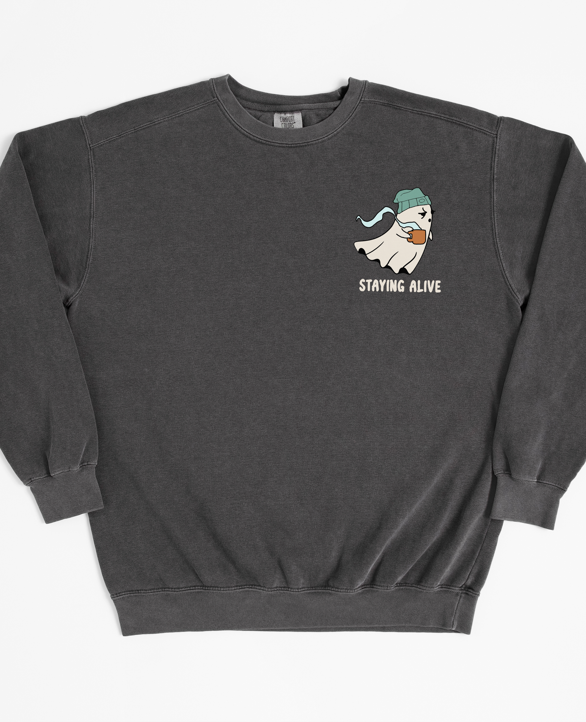 Even ghosts need a caffeine boost after a long night of haunts! Our soft and cozy Staying Alive sweatshirt will be your favourite to wear with your morning coffee! These cozy sweatshirts have a slightly oversized fit. Roomy enough for easy layering, yet stylish enough to wear on its own.