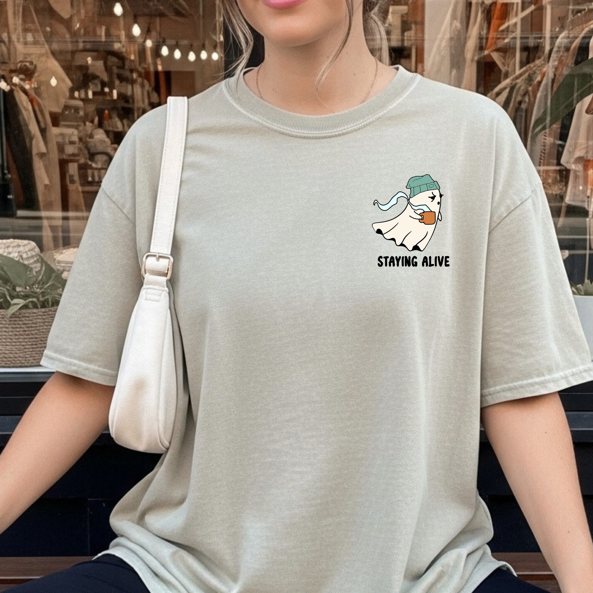 Even ghosts need a caffeine boost after a long night of haunts! Our soft and cozy Staying Alive tee will be your favourite to wear with your morning coffee!
